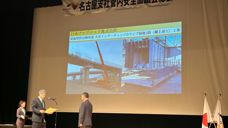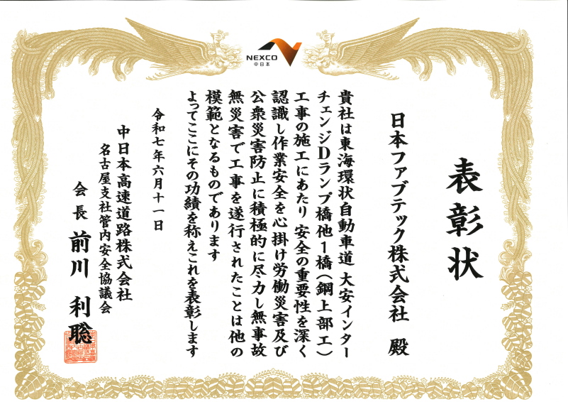 2025年6月11日(水)、NEXCO中日本 名古屋支社管内 安全協議会様より、表彰状を頂きました。対象工事は「東海環状自動車道 大安インターチェンジDランプ橋他1橋(鋼上部工)工事」です。