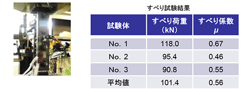 すべり試験より、高力ボルト摩擦接合と同等の継手耐力を有することを確認しています。連結板側のボルト孔には拡大孔を採用していますが、すべり係数μ=0.4以上を満足できます。