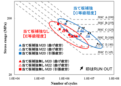 S-N図より、当て板補強したスタッド溶接部の疲労強度は、当て板補強無しに比べて、疲労強度が2等級向上します。