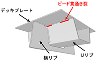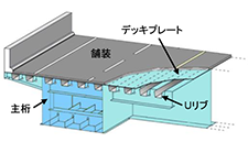 Uリブ鋼床版は、アスファルト舗装を介して輪荷重を直接支持するため、大型車交通量が多い重交通路線で、疲労損傷が発生しています。疲労損傷の内、デッキプレートとUリブの溶接ルート部からのき裂が多数報告されています。