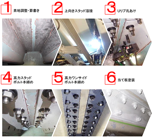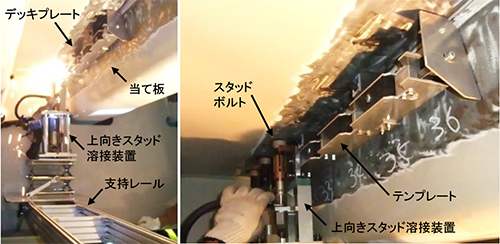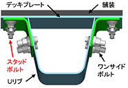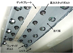 デッキプレートと当て板をM20高力スタッドボルトにより摩擦接合しています。