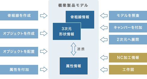 SYMPHONYとは、たくさんの橋梁部品の寸法とその配置を決める設計工程をもインテリジェント化する、製作にいたるまでのデジタル技術です。製品モデルを媒介とする情報の流れを達成するシステムです。GIS(地理情報システム)上への展開など、様々な場面への発展が予測されます。