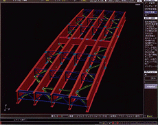 鋼橋の合理化・省力化に伴い、工場での『仮組立』を省略する場合があります。『仮組立』とは、製作した製品が要求される品質精度を満たしているかを検査するものです。しかし『仮組立』を省略する場合には、本システム WALTZ(ワルツ)を使って検査しています。 WALTZ は、3次元モデルを用いて『仮組立』をシミュレーションします。バーチャルリアティの技術で、橋梁の『仮組立』をコンピュータ上で行います。箱桁の中などをウォークスルーしたり、付属物と部材との干渉状態などもビジュアルに確認できます。当社を含め数社で共同開発したシステムです。